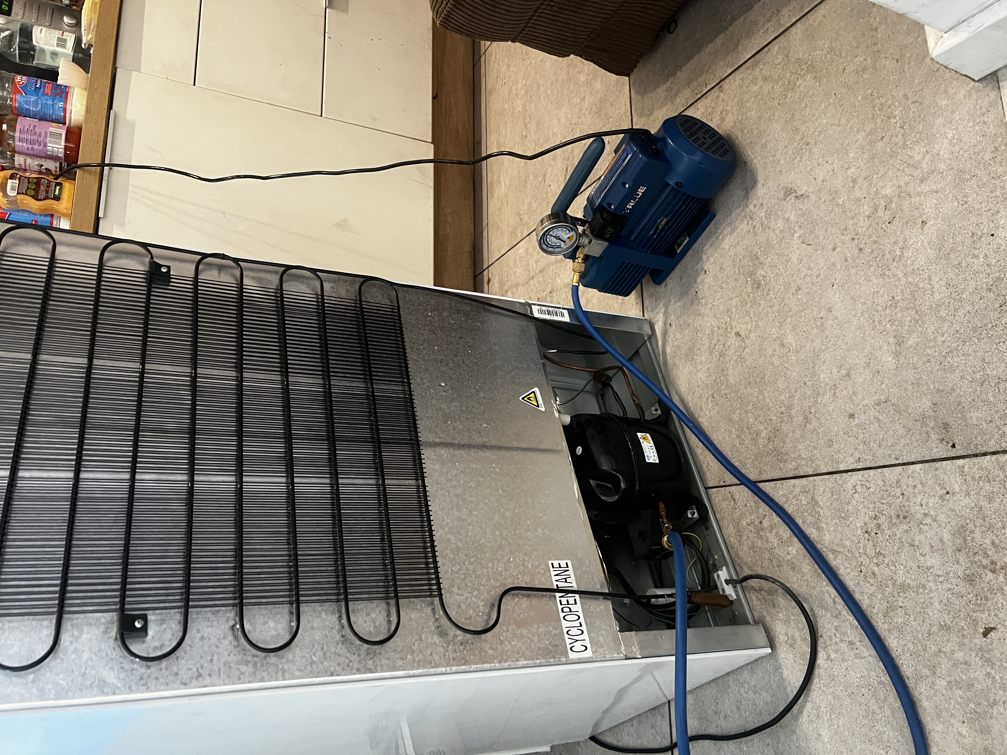 Witryna chłodnicza w sklepie spożywczym przestała chłodzić. Wykryliśmy ubytek czynnika chłodniczego, zlokalizowaliśmy nieszczelność i uzupełniliśmy instalację przy pomocy stacji serwisowej.