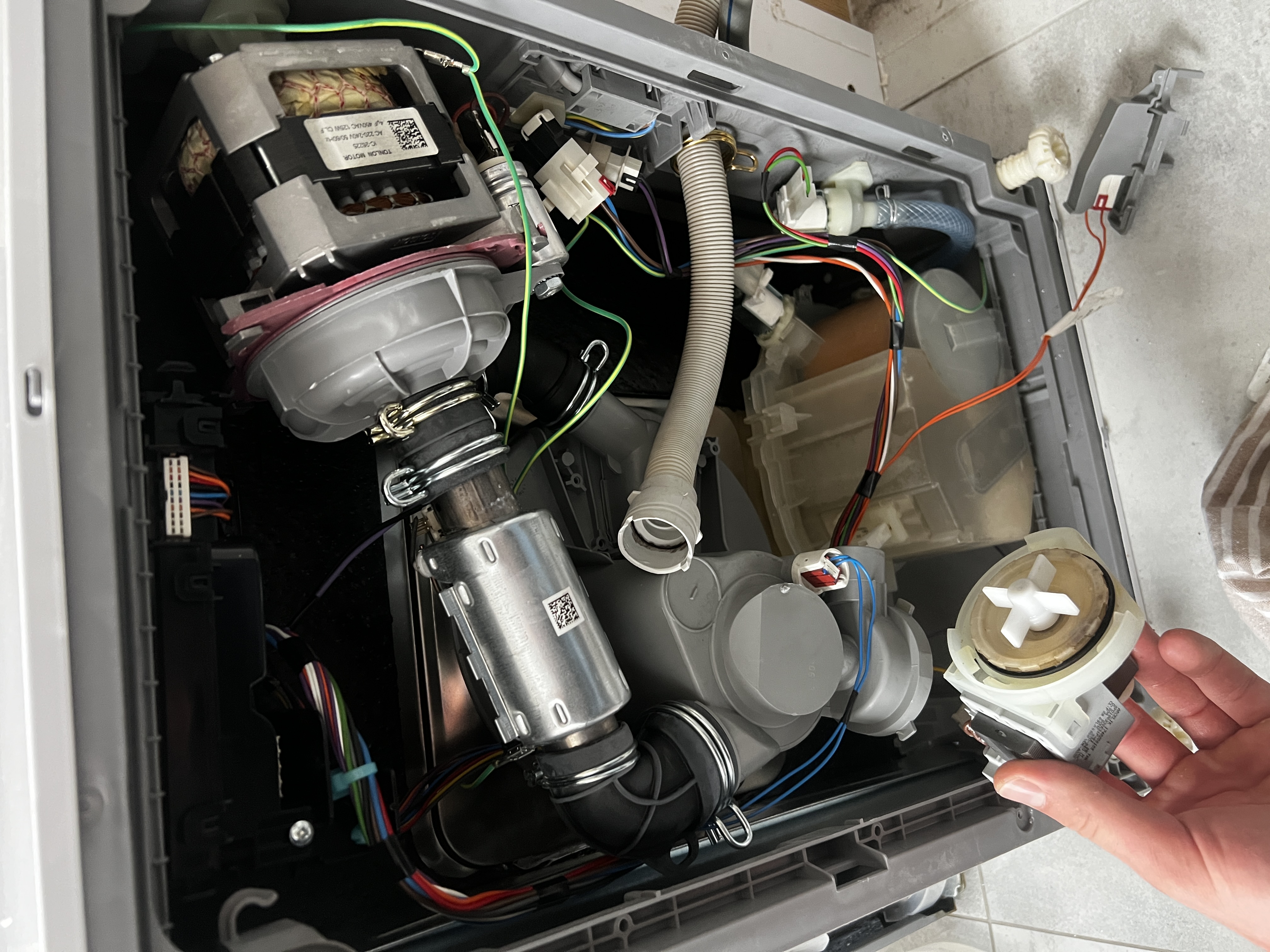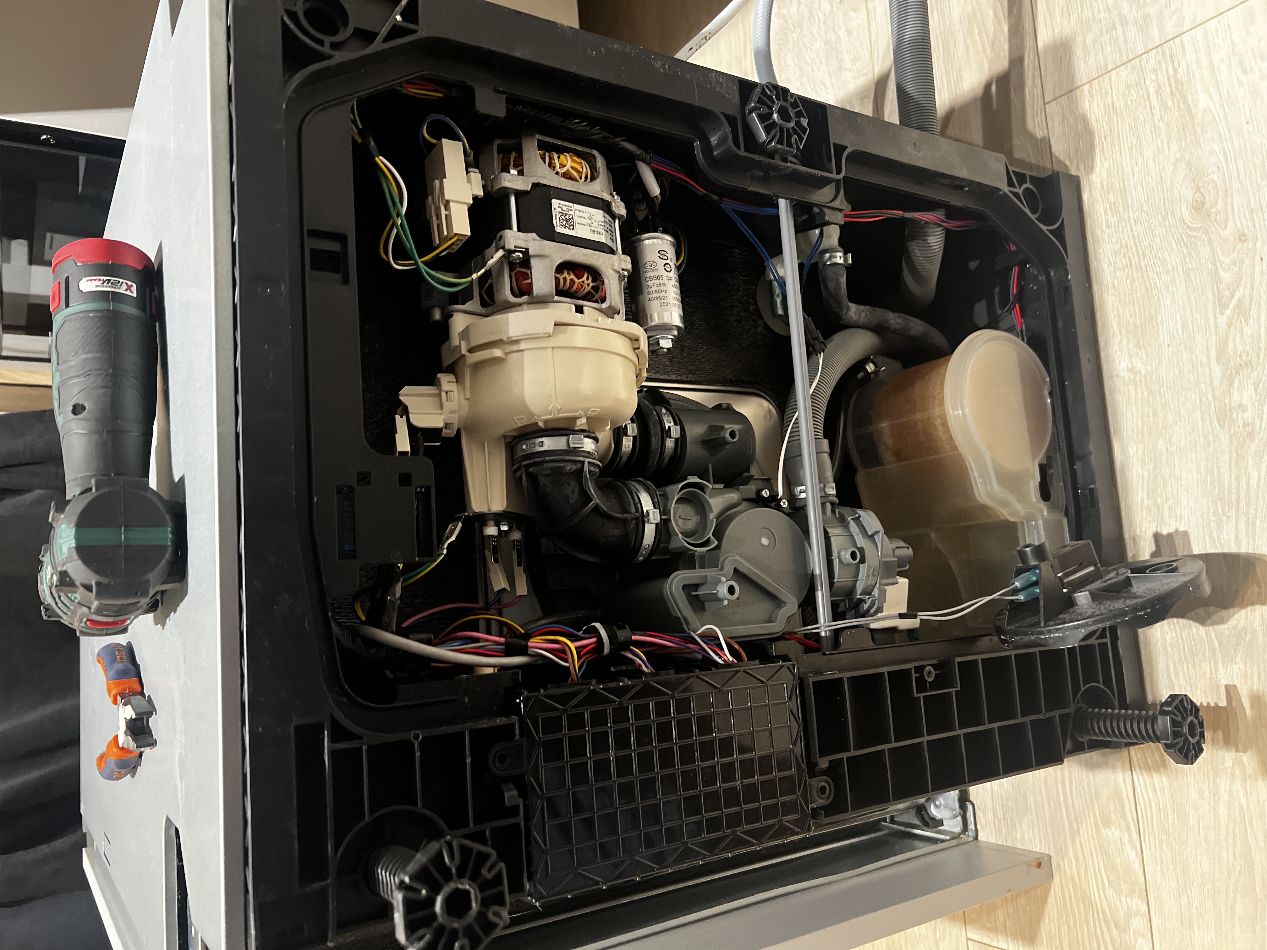Zmywarka nie odprowadzała wody po programie. Zdemontowaliśmy dolny panel, zdiagnozowaliśmy uszkodzoną pompę odpływową i wymieniliśmy ją na nową — zmywarka działa bez zarzutu.