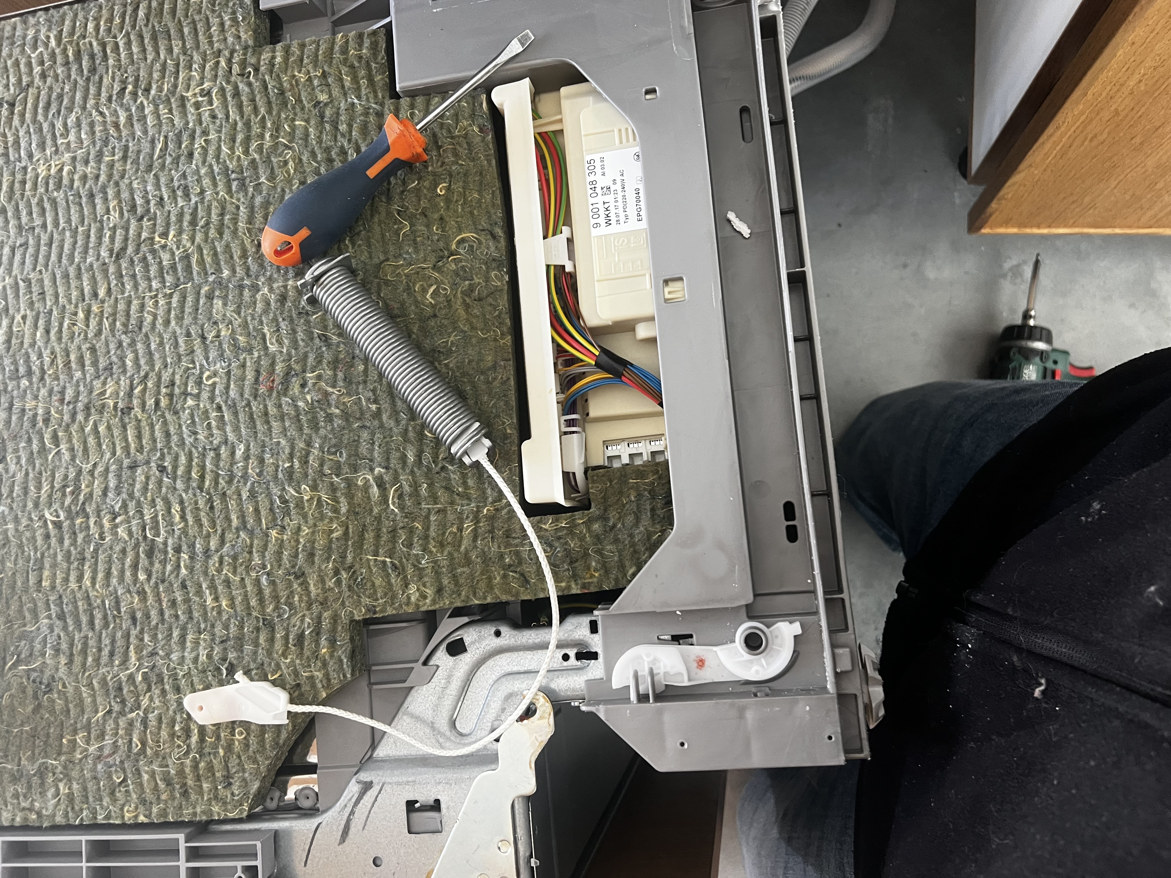 Drzwi zmywarki nie trzymały właściwej pozycji i opadały gwałtownie. Wymieniliśmy zużyte linki i zawiasy, przywracając płynne i bezpieczne otwieranie drzwi.