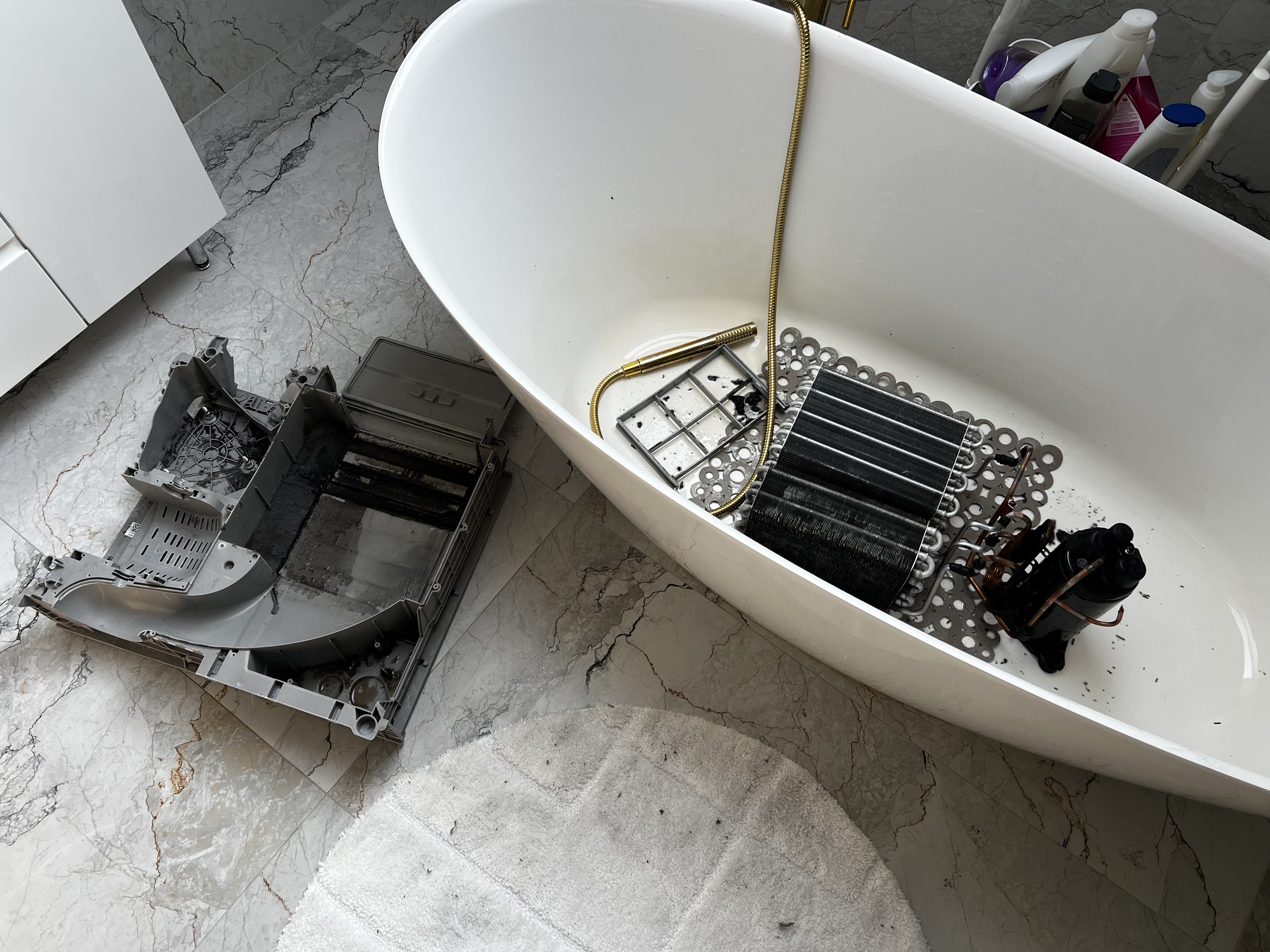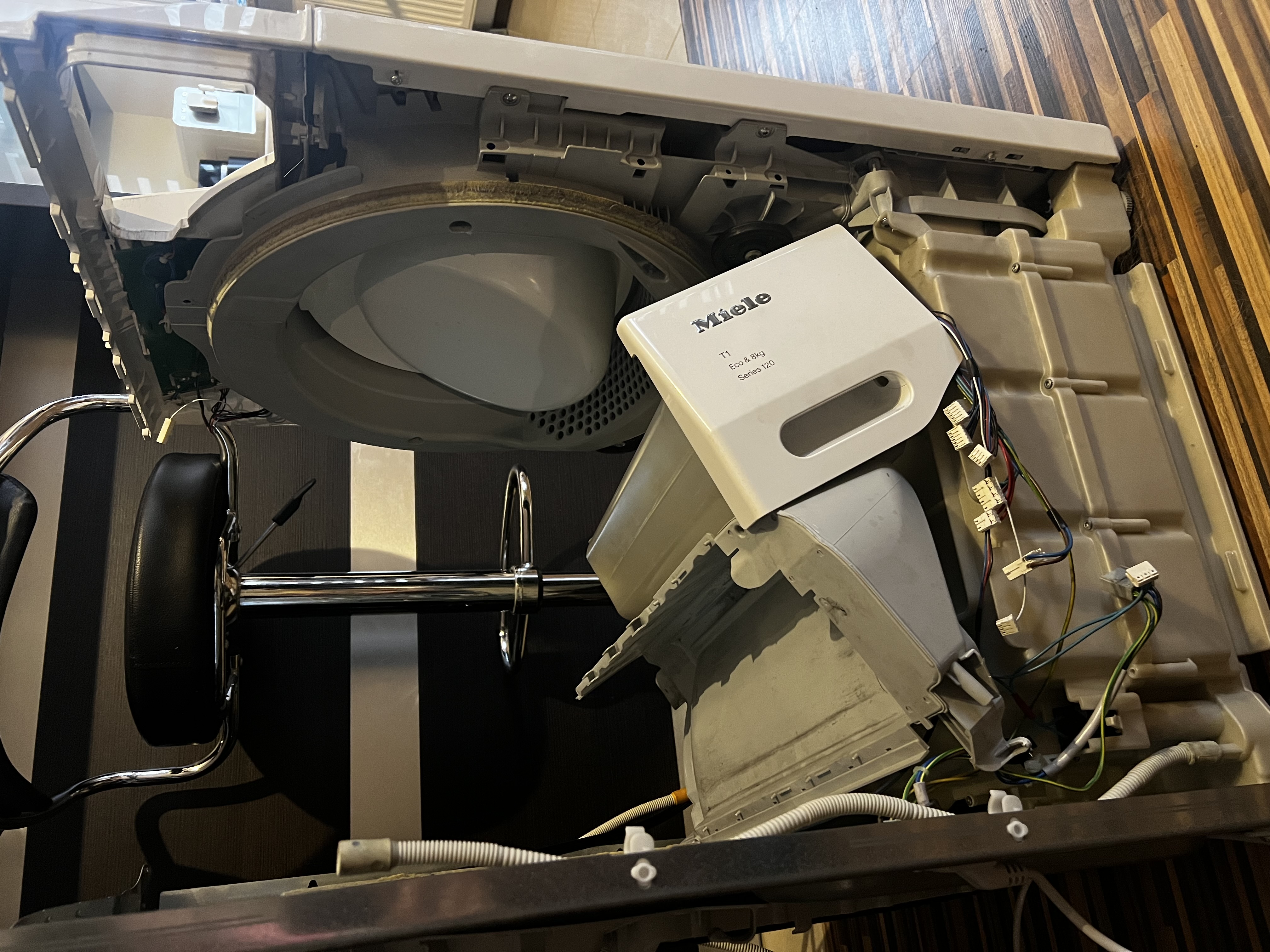 Suszarka Miele zgłoszona z powodu słabego suszenia i nieprzyjemnego zapachu. Zdemontowaliśmy komorę bębna, dokładnie wyczyściliśmy układ odprowadzania wilgoci i skraplacz.