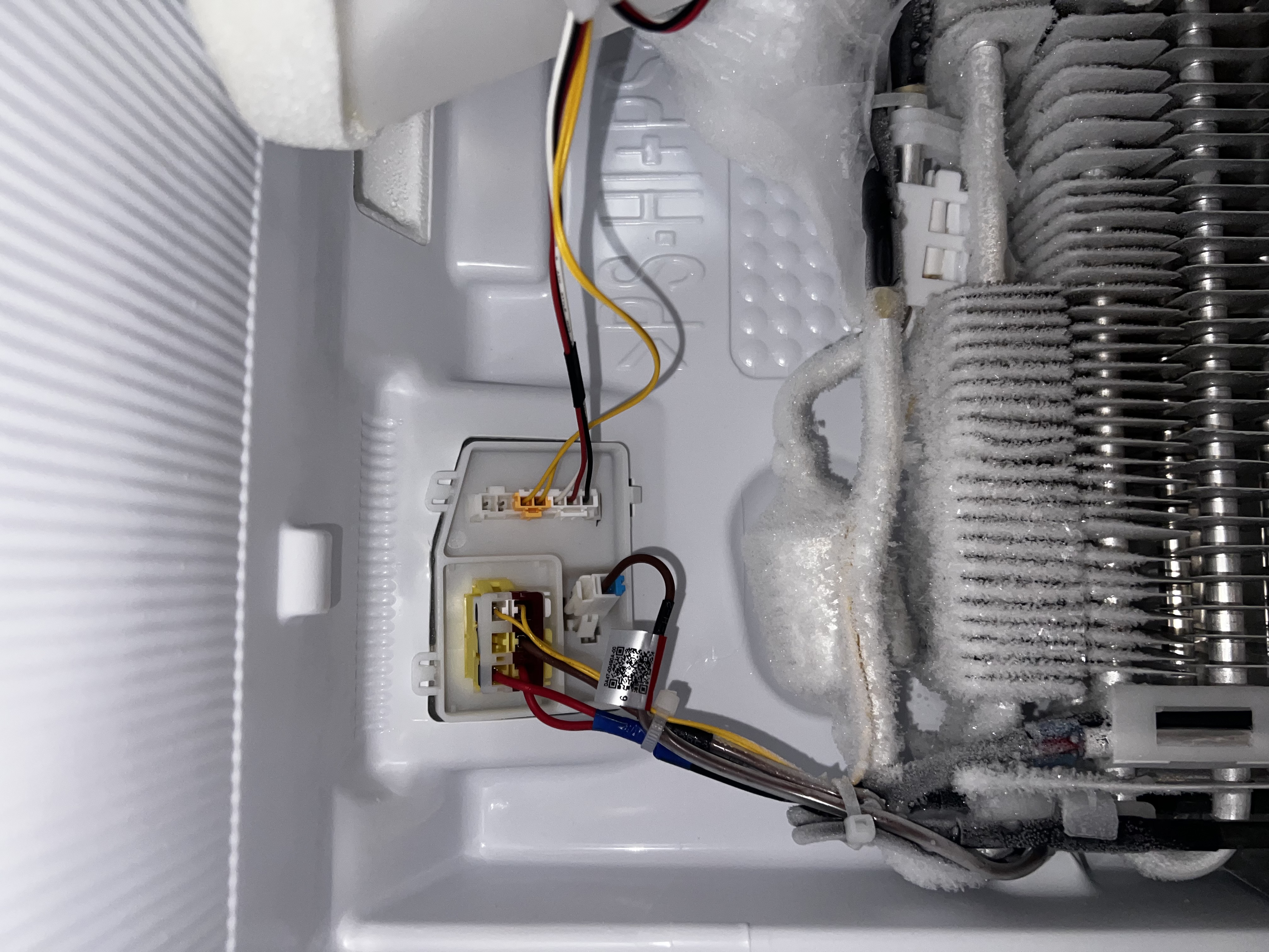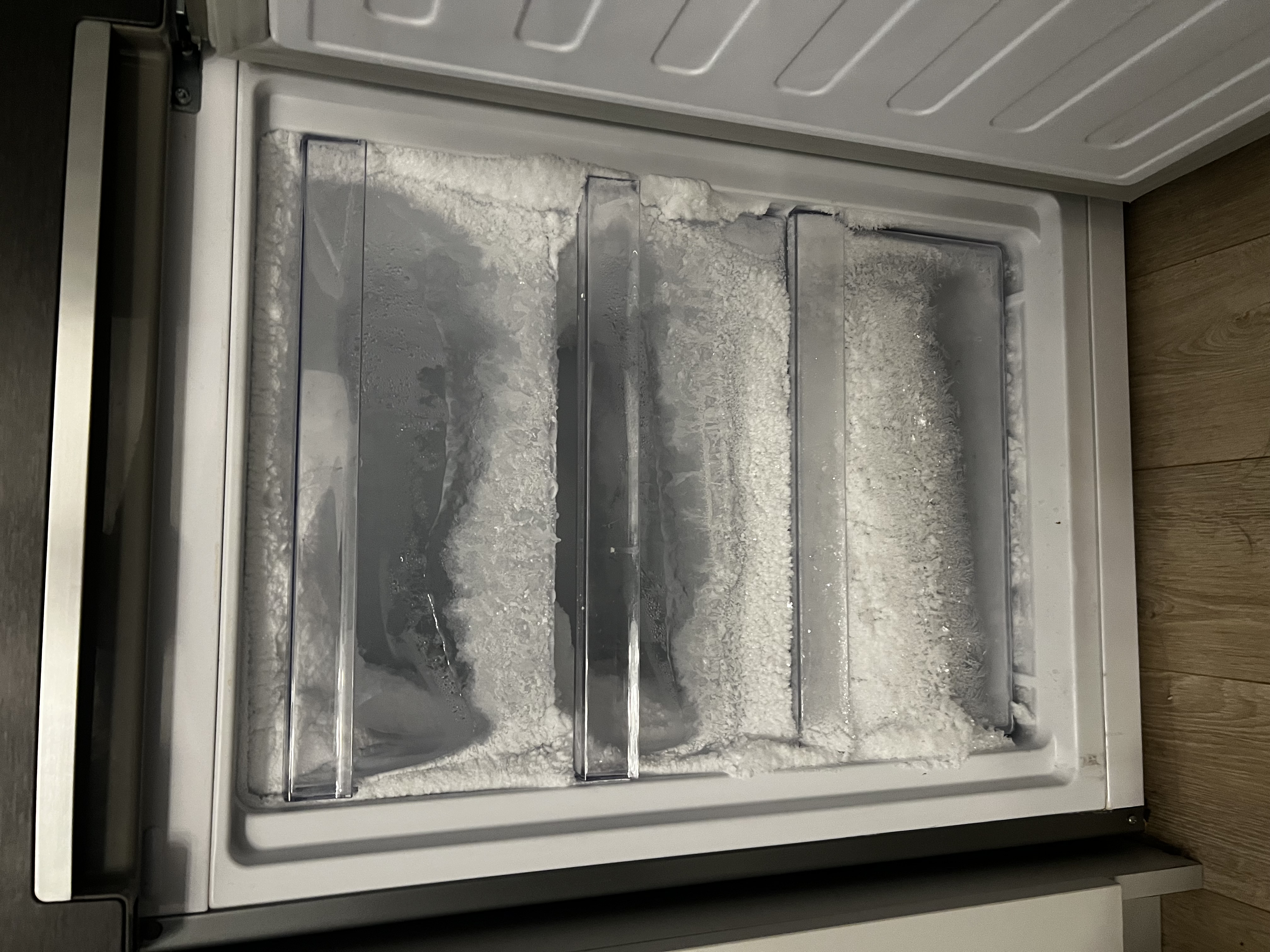 Parownik zamrażarki był szczelnie pokryty szronem przez uszkodzony termistor. Po odmrożeniu, wymianie czujnika i weryfikacji grzałki odmrażania lodówka prawidłowo realizuje cykle odszraniania.